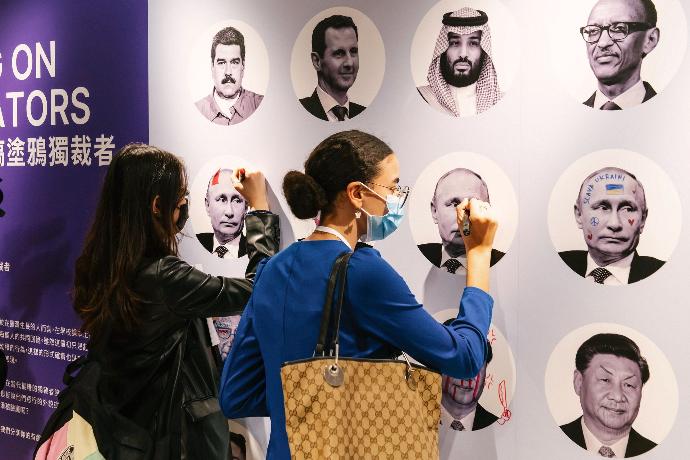 以針筒注射象徵自由力量,透過自拍惡搞級極權者,利用 T-shirt 呈現維吾爾族強迫勞動,喚起人權自由的團結力。